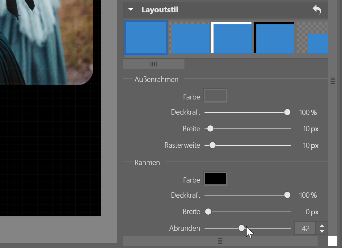 Nachfolgend finden Sie detailliertere Einstellungen der Rahmen, z.B. mit Rundungen und der genauen Breite des inneren und äußeren Rahmens.