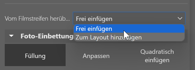 Bevor Sie mit dem Anordnen der Fotos beginnen, empfehlen wir Ihnen, den Drag-and-Drop-Modus des Filmstreifens auszuprobieren. Wenn Sie Frei einfügen wählen, wird das Foto eingefügt, indem Sie es an einer beliebigen Stelle platzieren. Wenn Sie Zum Layout hinzufügen wählen, wird ein Feld in der ausgewählten Vorlage ausgefüllt. Sie können dies entsprechend der Art und Weise, wie Sie das Foto einfügen, beliebig umschalten.