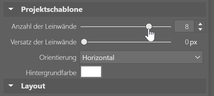 Auch hier verwenden wir die Collage im Modul Drucken, wählen aber im Abschnitt Projektschablone eine andere Anzahl von Leinwänden aus. Es ist Ihnen überlassen, wie viele Fotos Sie im Beitrag anordnen möchten. Sie können die Anzahl der Leinwände entweder mit dem Schieberegler auswählen oder sie manuell eintippen.