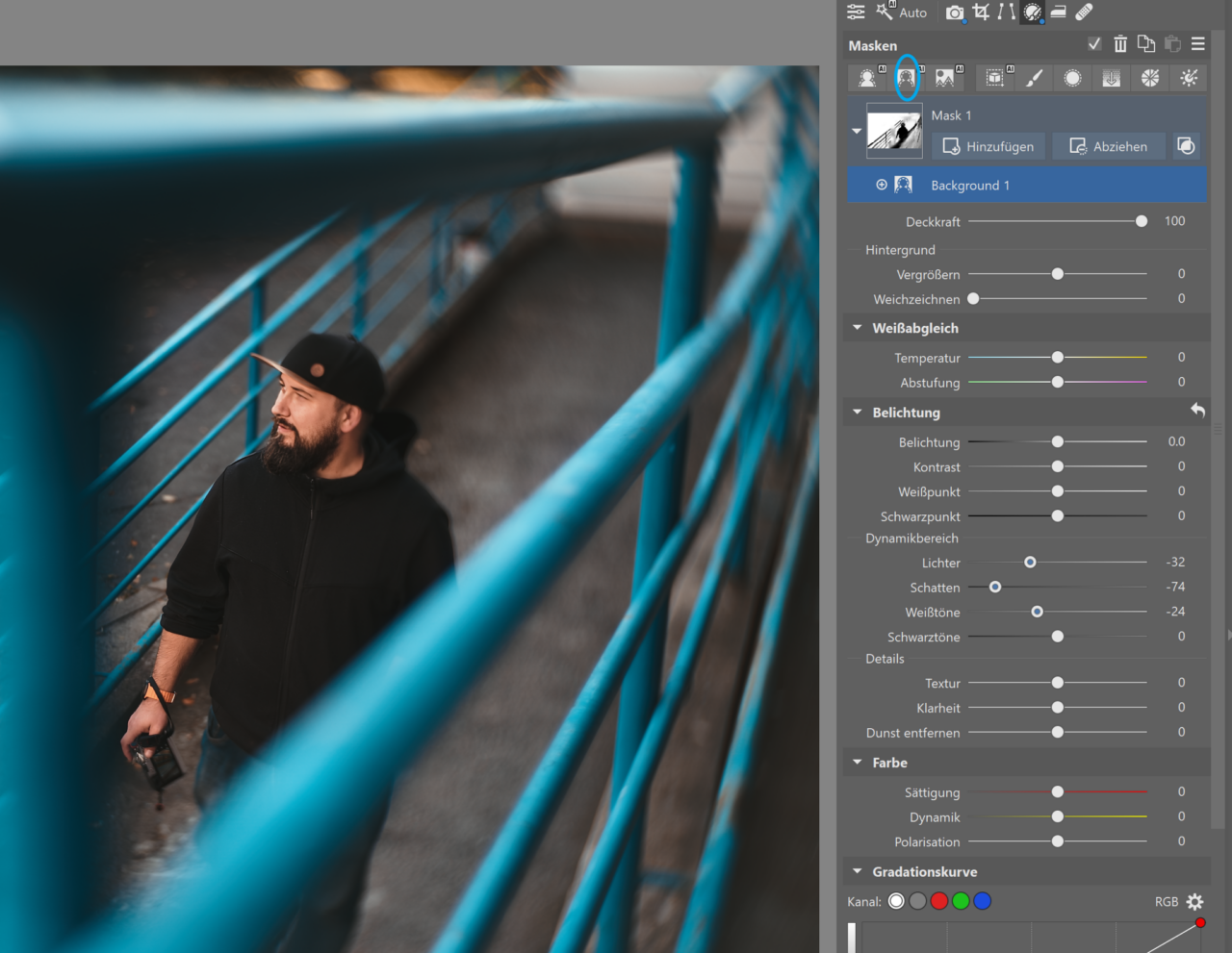 Eine weitere häufig auftretende Situation ist, dass das Foto etwas „flach” wirkt und das Hauptmotiv untergeht, da es genauso hell oder dunkel ist wie der Rest des Fotos. Um dieses Problem zu beheben, verdunkeln Sie den Hintergrund (oder hellen Sie das Hauptmotiv auf). Wechseln Sie zu Entwickeln und wählen Sie unter „Lokale Anpassungen“ (L) „Hintergrund“. Verringern Sie im Bereich Belichtung die Werte für Lichter, Schatten und gegebenenfalls Belichtung – je nachdem, was auf Ihrem Foto am besten aussieht.