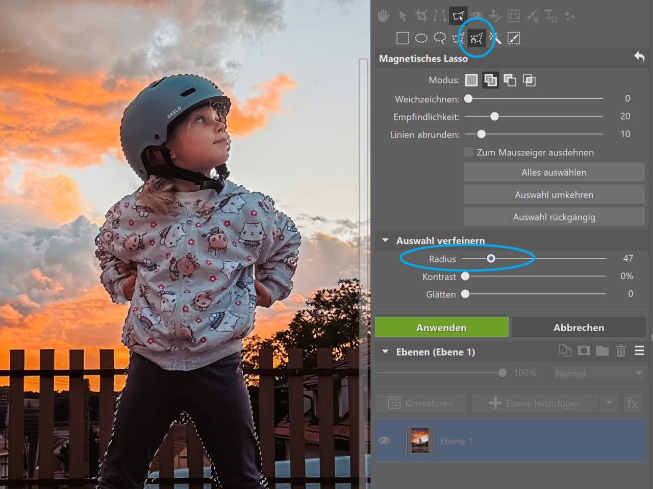 Öffnen Sie das Foto, dessen Hintergrund Sie weichzeichnen möchten, im Modul Editor (Bearbeiten). Duplizieren Sie die Ebene mit dem Bild und wählen Sie mit den Auswahlwerkzeugen die gesamte Person aus. In der Regel eignet sich dafür am besten das Magnetische Lasso (A). Die Auswahl können Sie anschließend mit der Funktion Auswahl verfeinern noch weiter optimieren.
