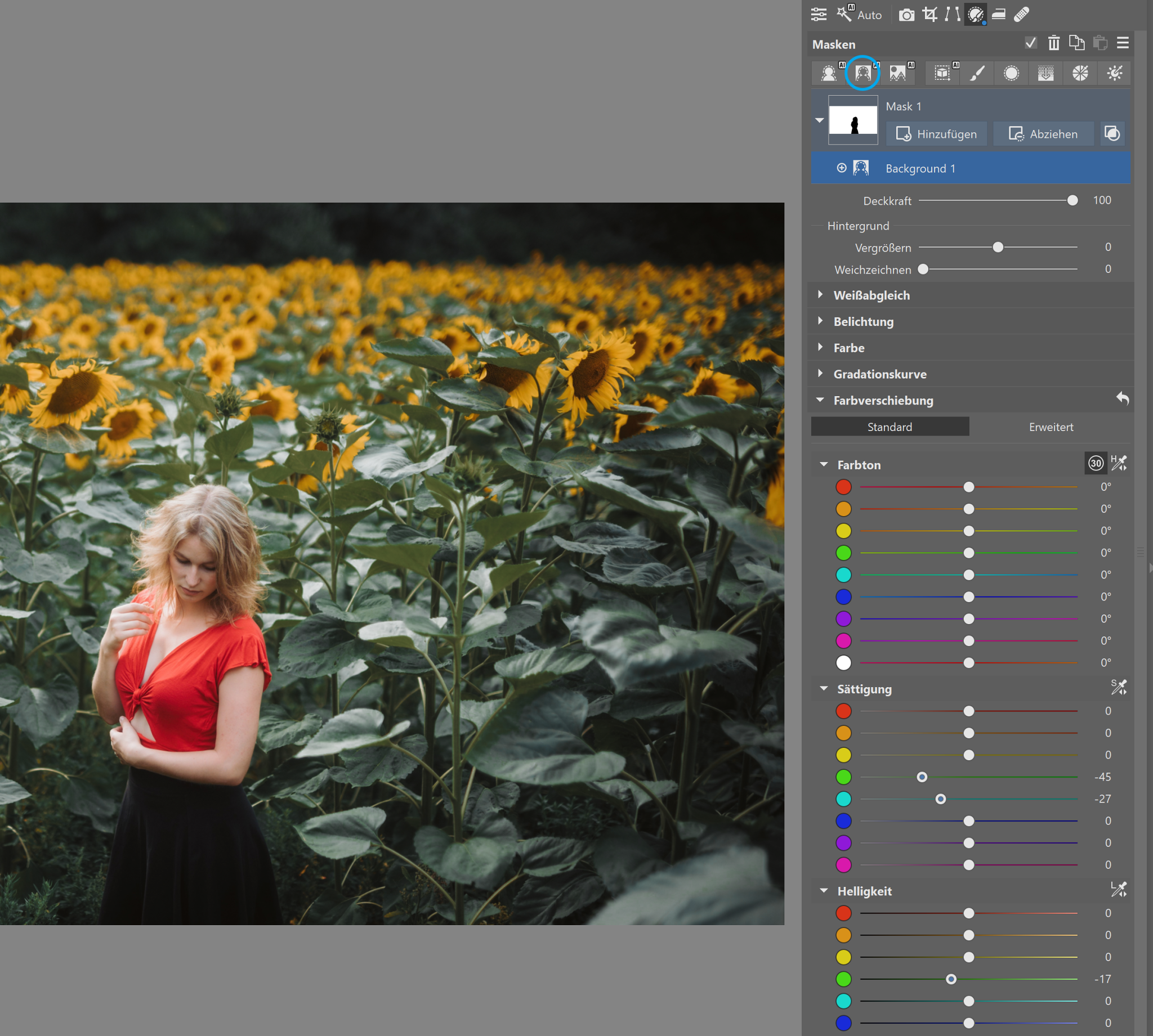 Wenn auf dem Foto Grünflächen den Hintergrund bilden, ziehen sie viel Aufmerksamkeit auf sich. Wenn Sie sie leicht unterdrücken, kommt die porträtierte Person besser zur Geltung. Öffnen Sie das Foto in Zoner Studio im Modul Entwickeln. Für ein präziseres Ergebnis wechseln Sie zu Lokale Anpassungen (L) und wählen Sie Hintergrund. Dann müssen Sie nur noch in der Farbverschiebung die Grüntöne finden und deren Sättigung verringern.