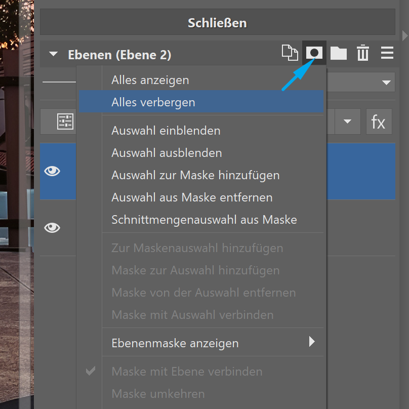 Klicken Sie anschließend auf der duplizierten oberen Ebene auf Auswahl einblenden. Auf der oberen Ebene bleibt somit nur der Vordergrund übrig.