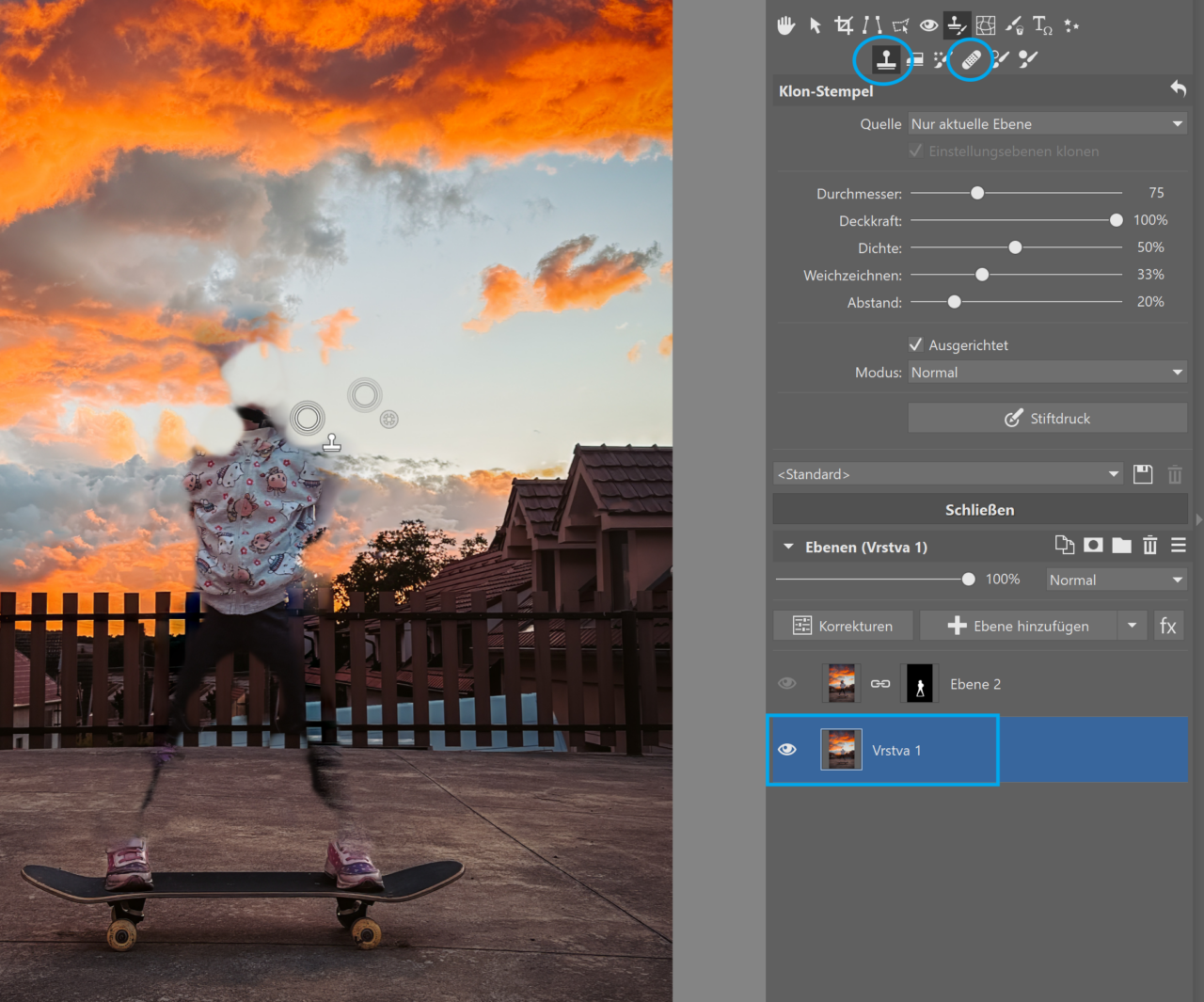 Klicken Sie auf die untere Ebene. Um ein optimales Ergebnis zu erzielen, müssen Sie die Ränder des Objekts retuschieren, da diese sonst beim Weichzeichnen Probleme verursachen würden. Am besten eignet sich hierfür der Klon-Stempel (S) oder der Retusche-Pinsel (J). Um bequemer arbeiten zu können, blenden Sie die obere Ebene mit dem Augensymbol neben der Ebene aus.