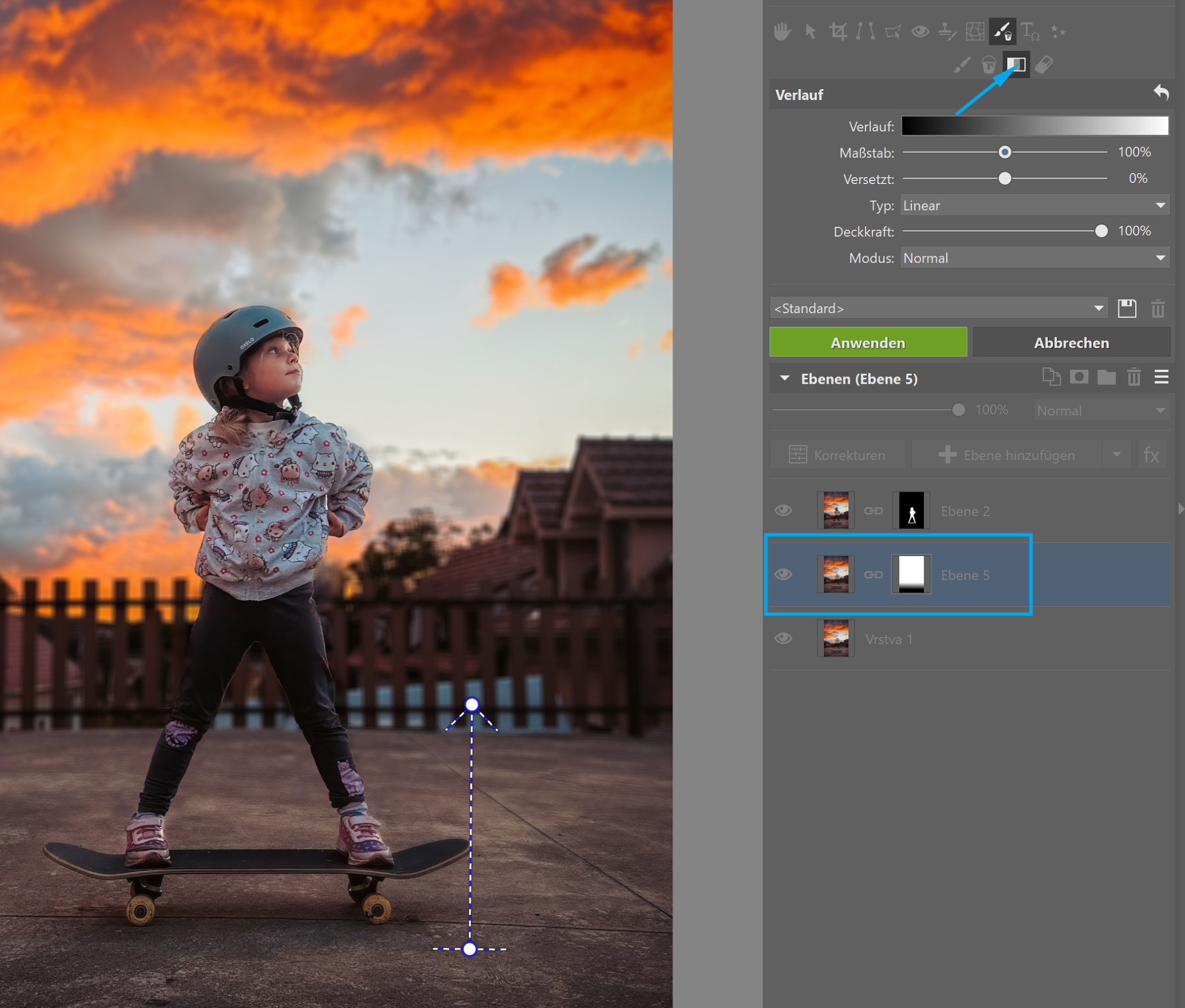 Bei gewöhnlichen Porträts, bei denen der Boden nicht zu sehen ist, wäre das schon alles, aber in unserem Fall macht es keinen Sinn, dass alles knapp unterhalb des Objekts unscharf ist, da sich der Boden auf derselben Fokusebene befindet. Wir müssen also die Schärfe im unteren Bereich entfernen. Das ist ganz einfach: Fügen Sie der Ebene eine Maske hinzu, indem Sie auf das Maskensymbol klicken und Alles anzeigen auswählen. Wechseln Sie oben zu den Zeichenwerkzeugen, wählen Sie Verlauf und ziehen Sie ihn von unten nach oben. Klicken Sie auf Anwenden und fertig.