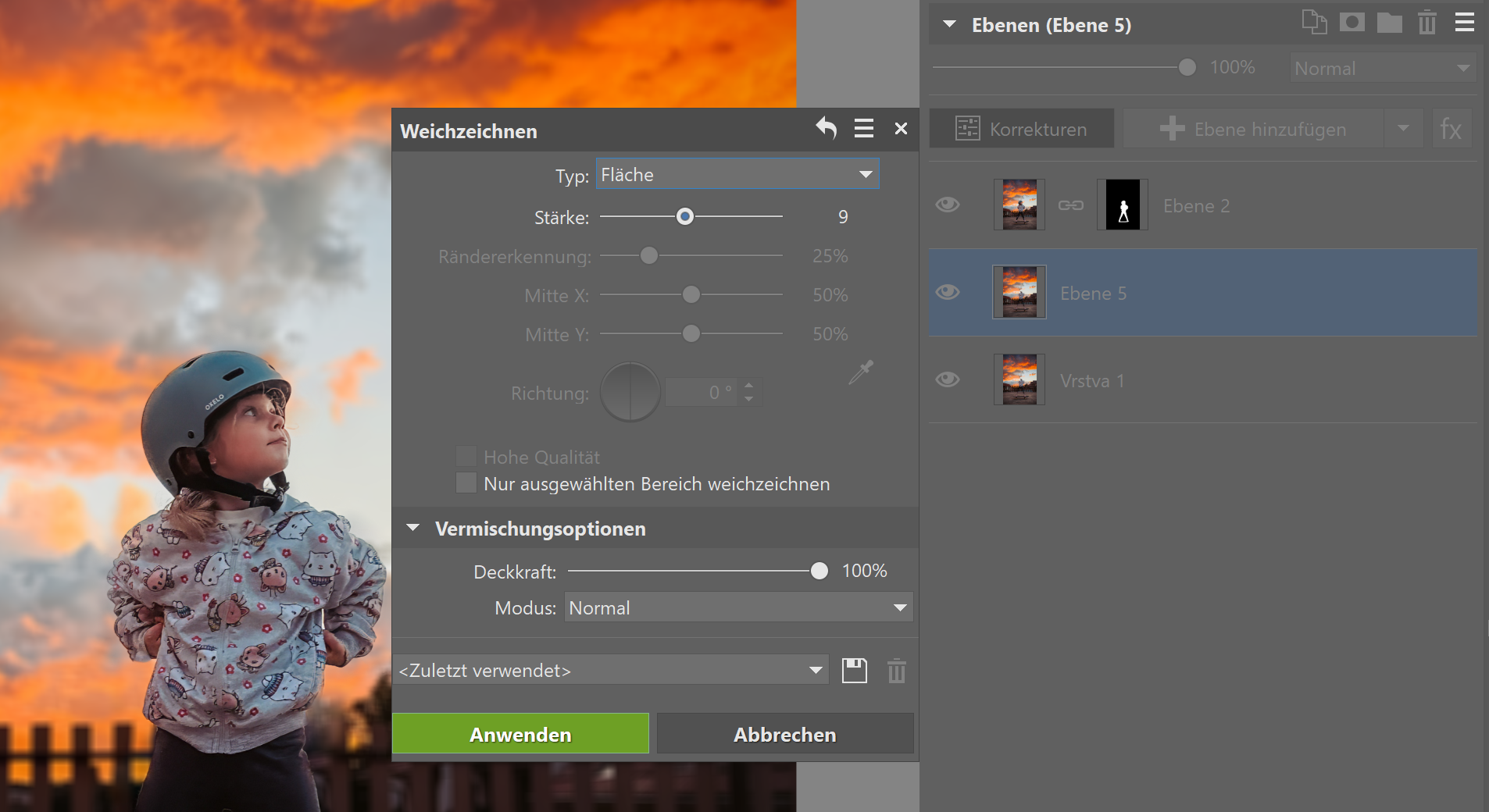 Wählen Sie die Weichzeichnungsart aus. In der Regel empfiehlt sich die Verwendung von Fläche oder Gauss. Legen Sie mit „Stärke“ fest, wie stark die Weichzeichnung sein soll.