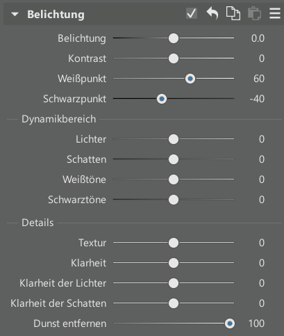 Einige Aufnahmen profitieren hingegen von einem verträumten Aussehen, das Sie mit etwas zusätzlichem Nebel erzielen können. Den Dunst auf dem gesamten Bild können Sie ganz einfach durch das genaue Gegenteil der im letzten Kapitel beschriebenen Vorgehensweise hinzufügen. Dazu müssen Sie entweder den Schieberegler Dunst entfernen nach links verschieben oder eine Kombination aus beiden Punkten verwenden und den Schwarzpunkt nach rechts und den Weißpunkt nach links ziehen.
