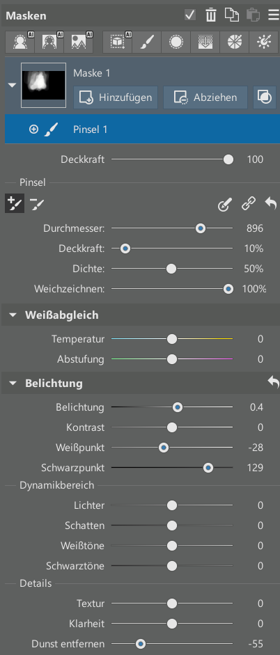 Beides bedeutet, dass Sie das Werkzeug Lokale Anpassungen verwenden, mit dem Sie eine Maske mit einem der verfügbaren Werkzeuge erstellen, am häufigsten mit Linearer Verlauf, Kreisförmiger Verlauf oder Pinsel. Nach der Erstellung der Maske stehen Ihnen wieder die gleichen Schieberegler zum Dunst entfernen oder zum Verschieben des Weiß- oder Schwarzpunkts zur Verfügung, nur dass sie auf einen bestimmten Bereich beschränkt sind.