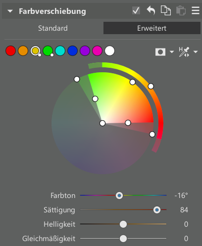 Wozu dient die Farbverschiebung? Wenn Sie nur bestimmte Farbtöne anpassen möchten (z. B. gelbe Blätter in Richtung Orange), aber andere Farben unverändert lassen möchten.