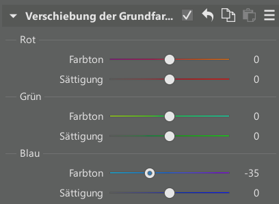 Je nachdem, welches Herbstfoto Sie vor sich haben, sind verschiedene Anpassungen der einzelnen Farbtöne sinnvoll. Der Blauton ist in der Regel links am besten, das lohnt sich als Erstes auszuprobieren. Die Farbtöne bei Grün und Rot sind manchmal besser in Richtung negativer Werte, manchmal in Richtung positiver Werte, hier gibt es Raum zum Experimentieren.
