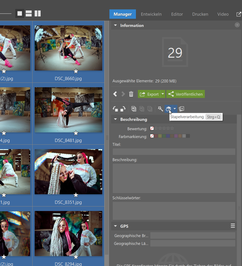 Wählen Sie die Fotos aus und klicken Sie auf das Icon Stapelverarbeitung.