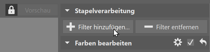 Klicken Sie auf das Icon Stapelverarbeitung sowie +Filter hinzufügen.