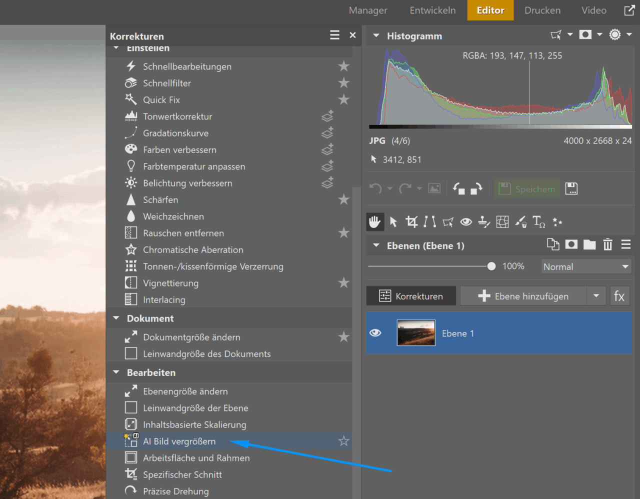 Die AI-Werkzeuge zum Vergrößern von Fotos in Zoner Studio ändern dies. Dank künstlicher Intelligenz kann das Programm Formen, Kanten und Texturen erkennen und sie sensibel vergrößern – oder sogar fehlende Details so ergänzen, dass das Ergebnis natürlich und scharf wirkt. Zoner Studio bietet zwei verschiedene Ansätze, die Sie je nach Situation verwenden können:
