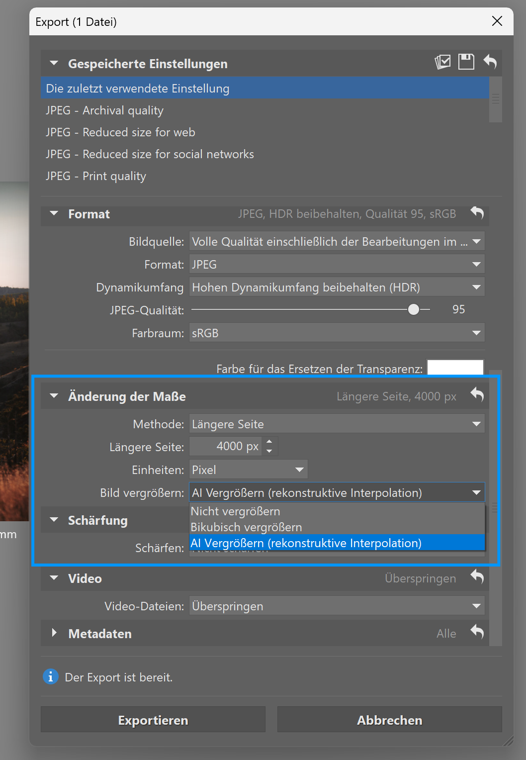 - Vergrößern von Fotos beim Export – Die sensible Vergrößerung mit AI Rekonstruktive Interpolation bietet ein besseres Ergebnis als die klassische bikubische Methode.