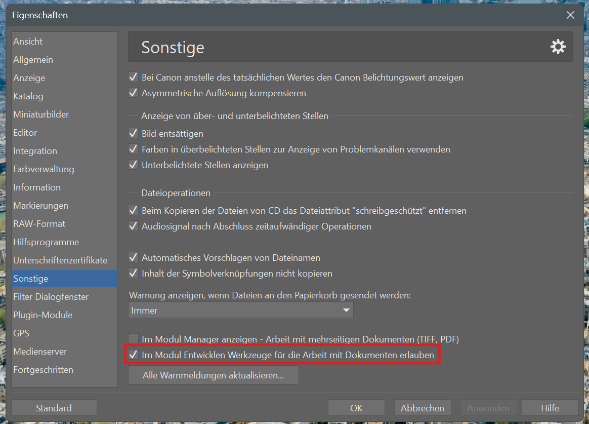 Standardmäßig ist die Annotationsfunktion in Zoner Studio nicht automatisch sichtbar. Daher müssen Sie sie aktivieren. Sie können dies tun, indem Sie die Tastenkombination Strg + M (Eigenschaften) -> Sonstige -> Im Modul Entwickeln Werkzeuge für die Arbeit mit Dokumenten erlauben.