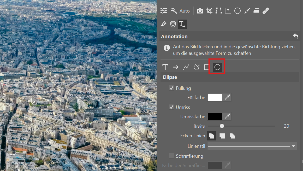 Verwenden Sie das Werkzeug Ellipse, um die gewünschte Stelle zu markieren. Zusammen mit dem Rechteck sind dies die einfacheren Werkzeuge, wir werden uns aber auch den komplexeren zuwenden.