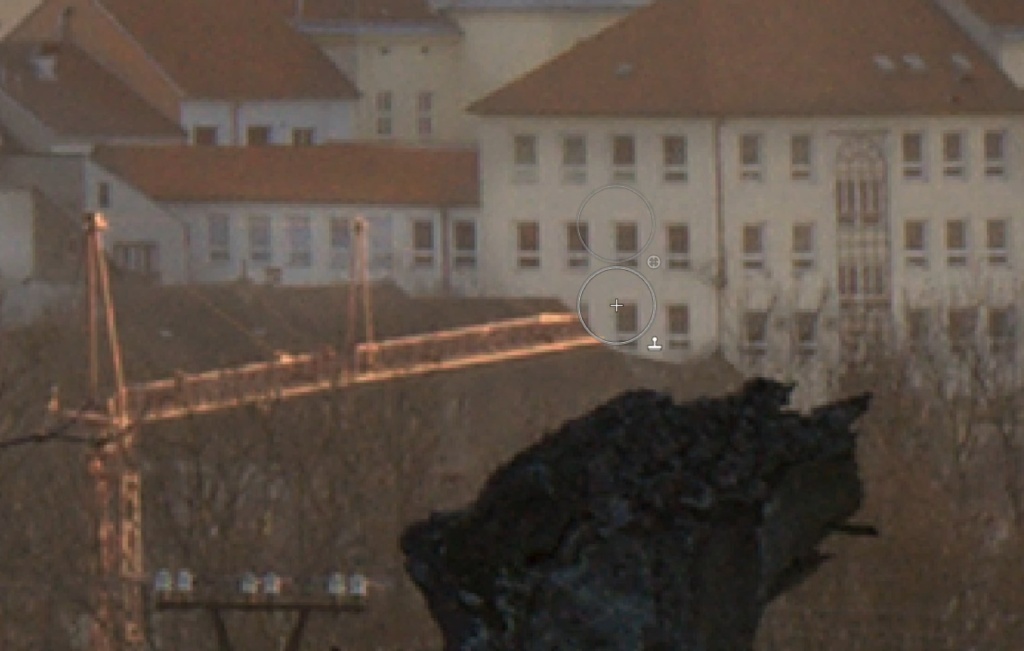 Zunächst muss ich den Arm des Krans entfernen. Hierfür eignet sich der Klonstempel (S) am besten. Mit ihm nehme ich die Struktur der Außenwände (ein naheliegendes Fenster) auf und male dann über die problematischen Stellen. Auch mit diesem Tool wähle ich mit der Strg-Taste den Quellbereich aus und übermale (retuschiere) dann mit der linken Maustaste den gewünschten Bereich. Mit einer Kombination aus den beiden Werkzeugen Klonstempel und Retusche Pinsel entferne ich dann schrittweise sowie vorsichtig den kompletten Kran.