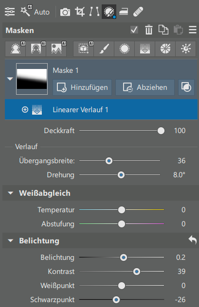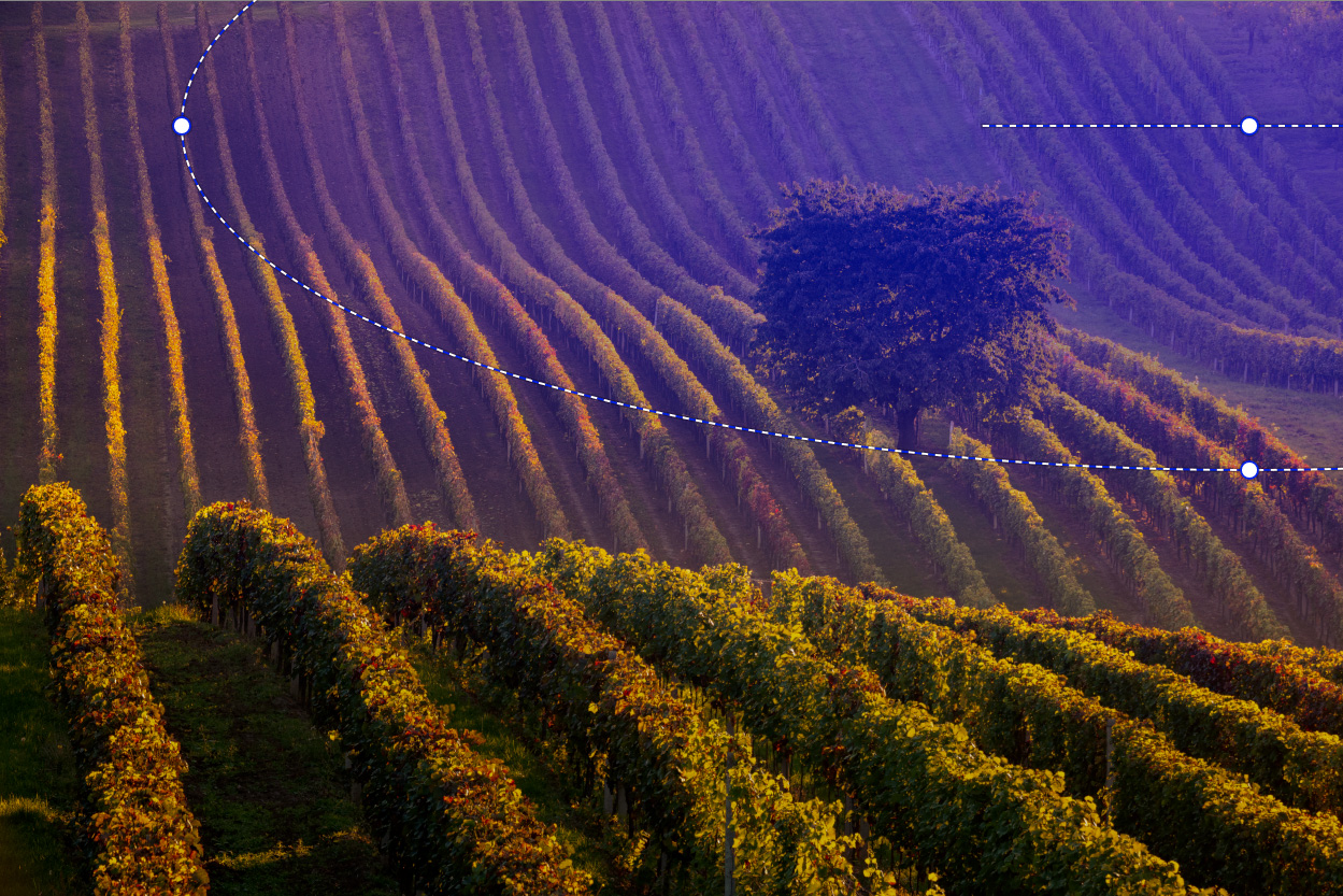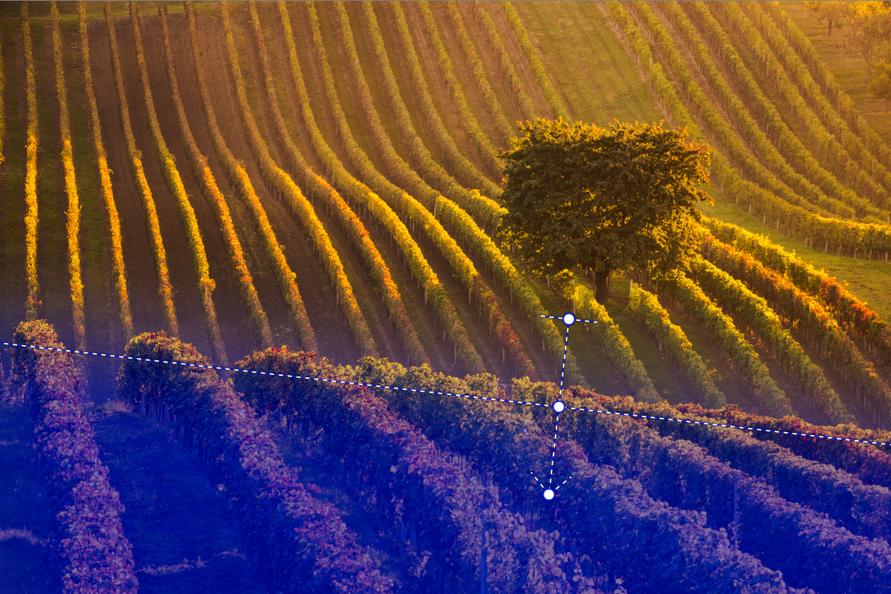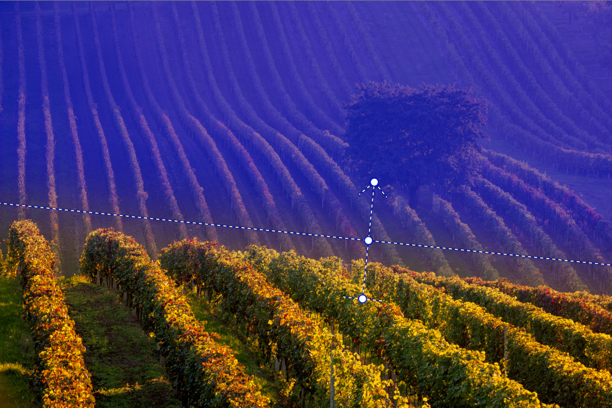 Wir verwenden erneut den Linearen Verlauf (G), nur umgekehrt. Bei dieser Maske reicht es aus, den Schieberegler für die Belichtung zu verringern, damit die nächstgelegenen Weinberge nicht mehr so dominant im Bild erscheinen.