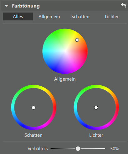 Die Szene wirkt etwas zu neutral, deshalb habe ich mich entschieden, die warme Morgensonne über dem Baum hervorzuheben. Dabei hat mir der Kreisförmige Verlauf (R) mit etwas komplexeren Einstellungen geholfen. Die Erhöhung der Belichtung und die Verringerung des Kontrasts waren einfach, aber um einen starken warmen Farbton hinzuzufügen, reichte der Schieberegler für die Weißtemperatur nicht aus. Deshalb habe ich die Farbtönung verwendet und den Allgemein-Kreis in Richtung Orange verschoben (wenn das nicht ausgereicht hätte, hätte ich Kurven oder Mit Farbe überlagern verwendet).