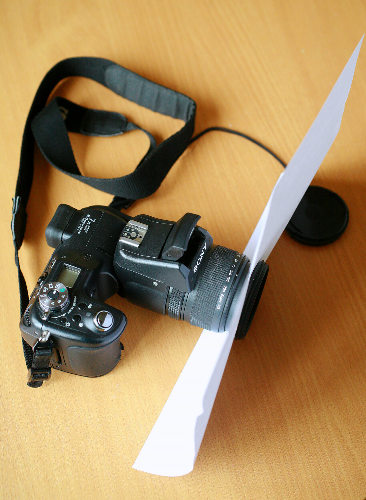 Bevor der Kleber trocknet, biegen wir die Ecken – auf der einen Seite mehr, auf der anderen weniger. Dann legen wir die Karte mit der stärker gebogenen Seite auf den Blitz und richten den Lichtstrahl auf die Wand.