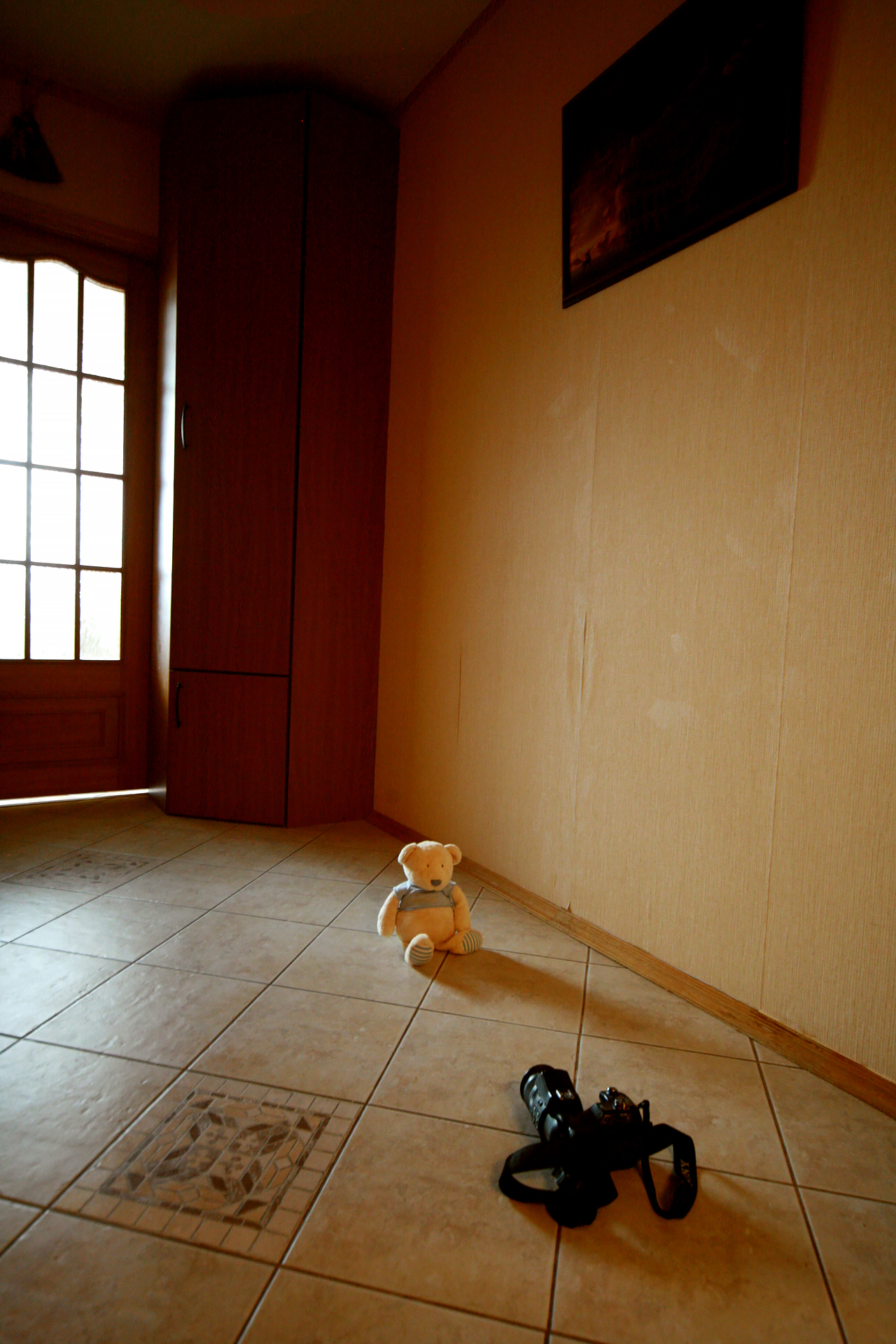 Wir haben folgende Lichtsituation: einen dunklen Flur mit einem schwachen bläulichen Licht auf der einen Seite und einem schwachen gelblichen Licht auf der anderen Seite. Wenn wir ohne Blitz fotografieren würden, müssten wir die ISO-Empfindlichkeit stark erhöhen – und das bedeutet, wie wir alle wissen, Bildrauschen. Außerdem käme es zu einer Vermischung der Farbtemperaturen (manchmal ist dieser Effekt interessant, aber in diesem Fall unerwünscht).