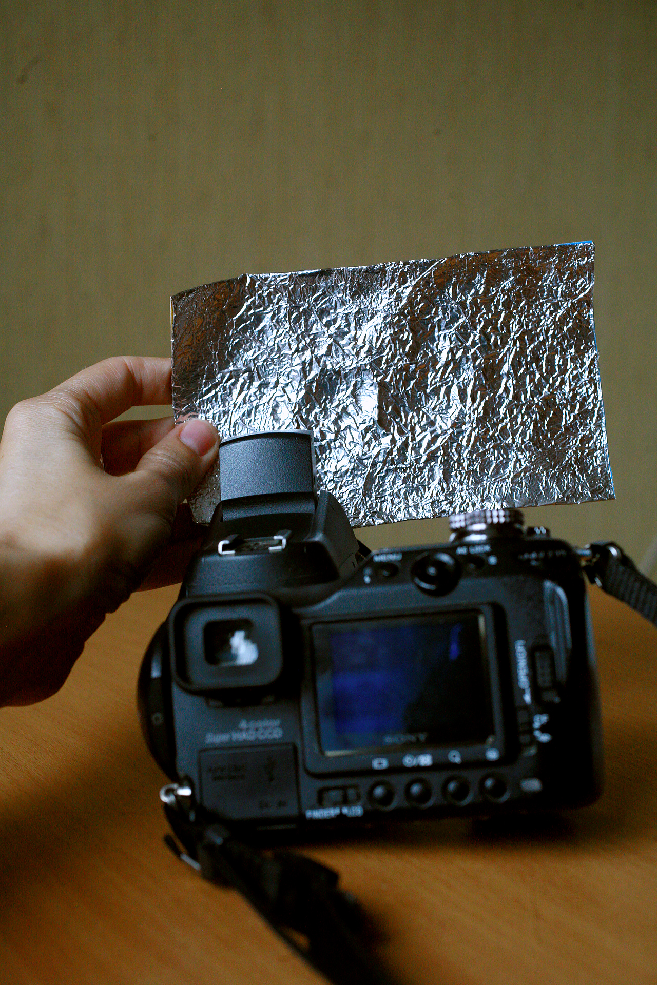 Ich persönlich mag warmes Licht, doch manchmal ist es zu viel. In diesem Fall ersetzen wir die Handfläche durch ein Stück Alufolie, die auf Karton geklebt wird. Die zerknüllte Alufolie bildet feine Falten, die den Lichtstrahl noch mehr streuen.