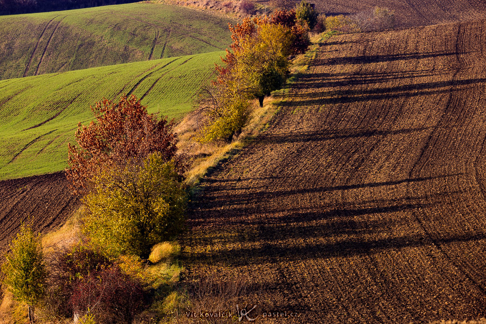Einzelne Bäume oder kleine Wäldchen ergänzen die Szenerie auf passende Weise und werfen morgens und abends Schatten auf die leeren, gepflügten Flächen.