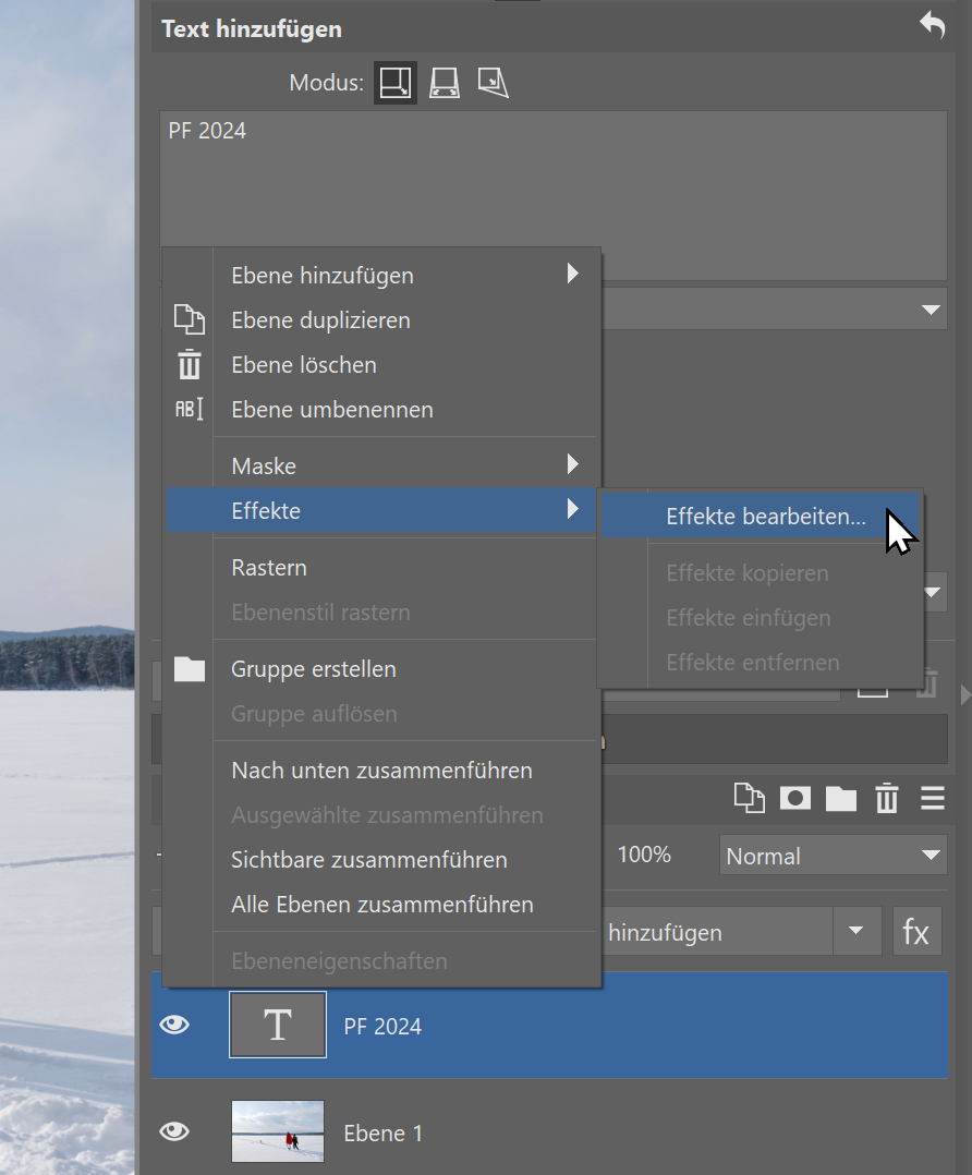 Damit die PF besser sichtbar ist, sollten Sie dem Text eine kontrastreiche Farbe verleihen. Klicken Sie mit der rechten Maustaste auf die Ebene und dann auf Effekte > Effekte bearbeiten.