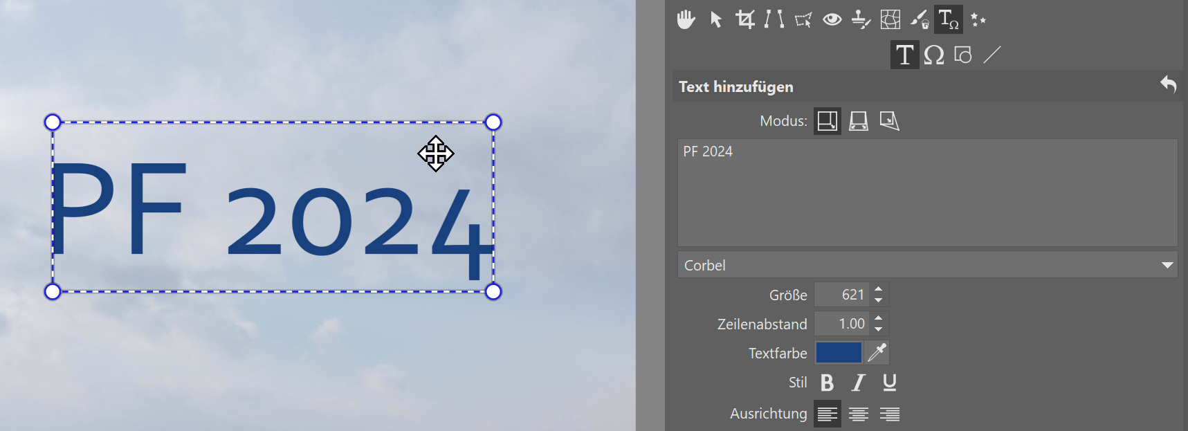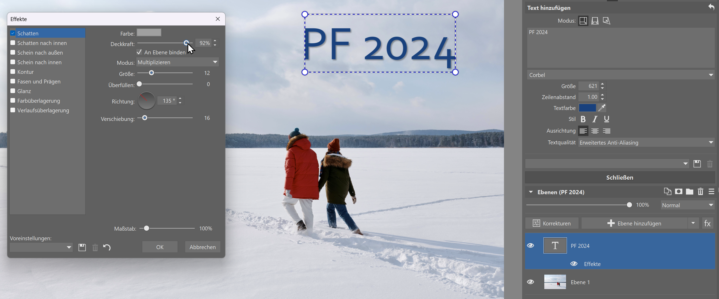 Tragen Sie jetzt den Neujahrswunsch in das Textfeld ein. Danach verschieben Sie die ausgewählte Textebene mit der Maus an eine passende Stelle, damit die PF gut lesbar ist.