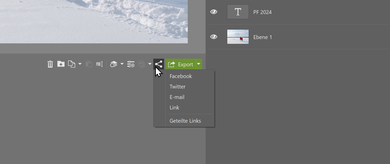 Die fertige PF verschicken Sie schnell und einfach in Zoner Studio mit der Schaltfläche Veröffentlichen. Zur Auswahl stehen Ihnen mehrere Möglichkeiten. Angefangen bei dem Versand per E-Mail, der Veröffentlichung auf Facebook bis hin zur fortgeschrittenen Veröffentlichung auf mehreren sozialen Medien.