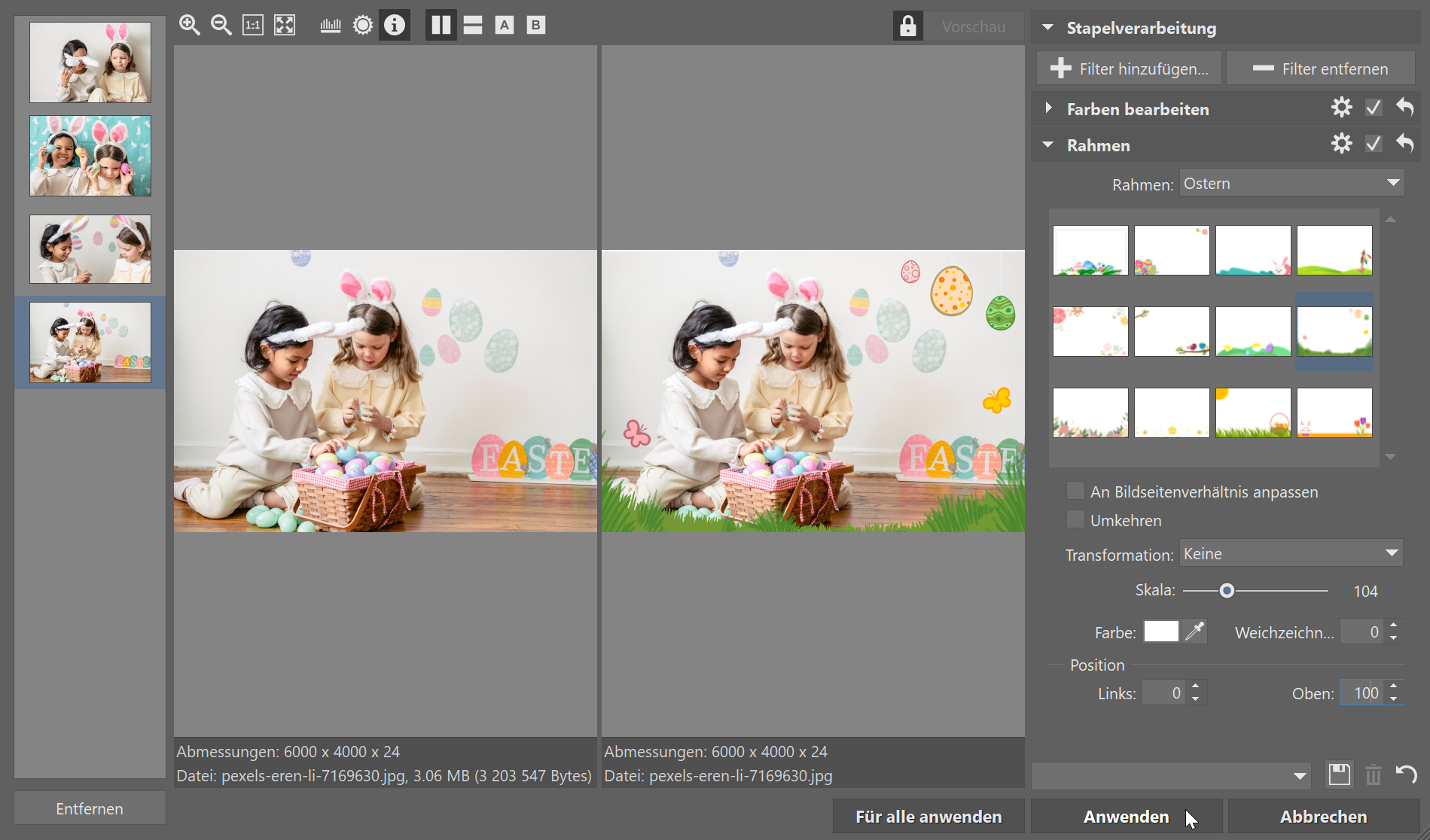 Sie können den Rahmen auch auf mehrere Fotos übertragen. Wechseln Sie hierzu zum Modul Manager, markieren Sie die entsprechenden Fotos und starten Sie die Stapelverarbeitung (Strg+Q). Danach klicken Sie auf +Filter hinzufügen… und wählen wieder den Rahmen aus und nehmen entsprechende Einstellungen vor. So verzieren Sie mit nur wenigen Klicks beispielsweise eine ganze Fotokollektion.