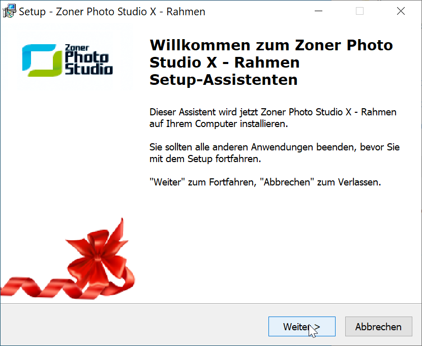 Sobald Sie die Rahmen heruntergeladen haben, öffnen Sie die Installationsdatei und bestätigen mit Weiter. Danach werden die Fotorahmen automatisch in den gleichen Ordner installiert, wo Sie Zoner Studio installiert haben. Der Installationspfad lautet in der Regel folgendermaßen: C:Program FilesZonerPhoto Studio 19.