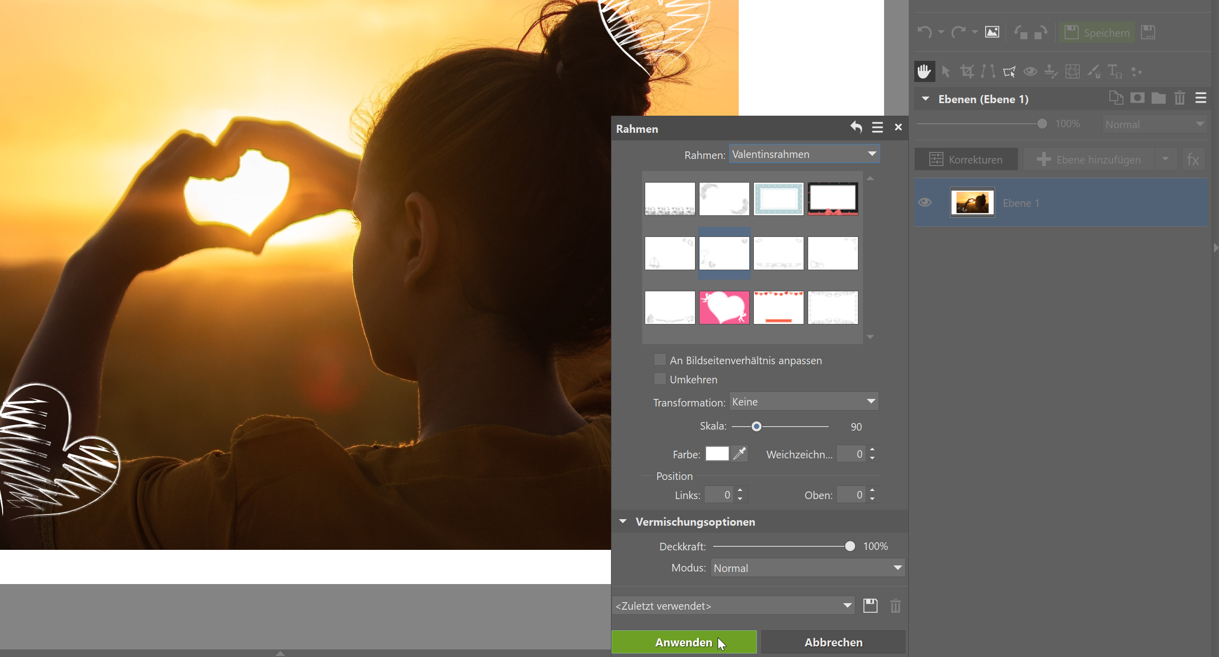 Sie werden bei den Rahmentypen jeweils mehrere Rahmen zur Auswahl haben. Wählen Sie den Rahmen aus, der Ihnen am meisten gefällt bzw. am besten zum Foto passt. Sie können DIe Rahmen anschließend noch bearbeiten – Anpassung an das Seitenverhältnis, drehen usw.