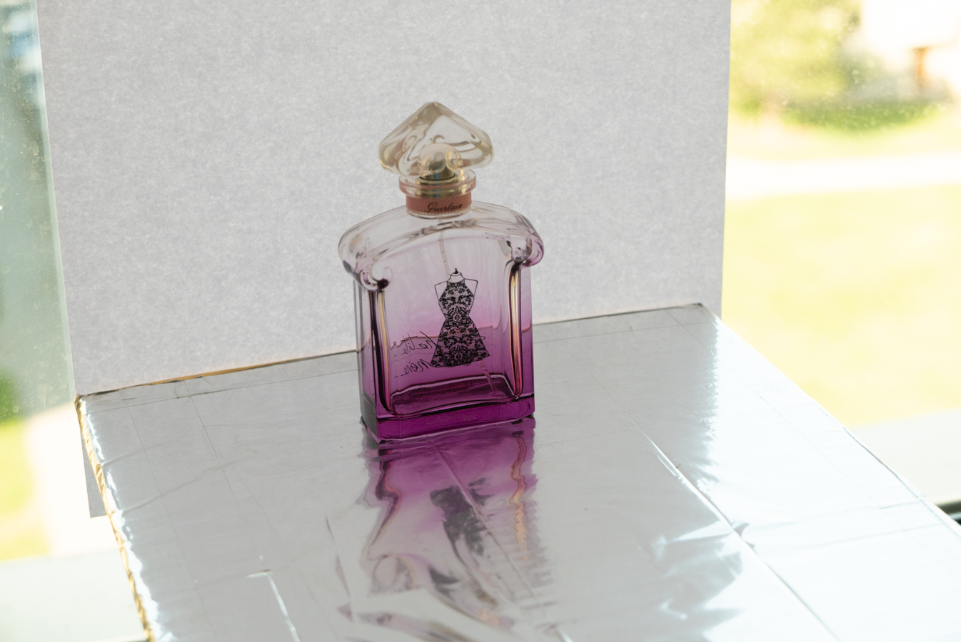 Für eine außergewöhnliche Produktfotografie können Sie versuchen, das Produkt auf einer glänzenden Oberfläche zu platzieren, die eine Reflexion erzeugt. Sie können dazu eine Glasplatte verwenden, die Sie auf dunkles Papier oder Stoff oder bereits getöntes Glas legen. Wenn Sie jedoch eine Reflexion erreichen wollen, die nicht vollständig statisch ist, können Sie die reflektierende Oberfläche aus Aluminiumfolie erzeugen.