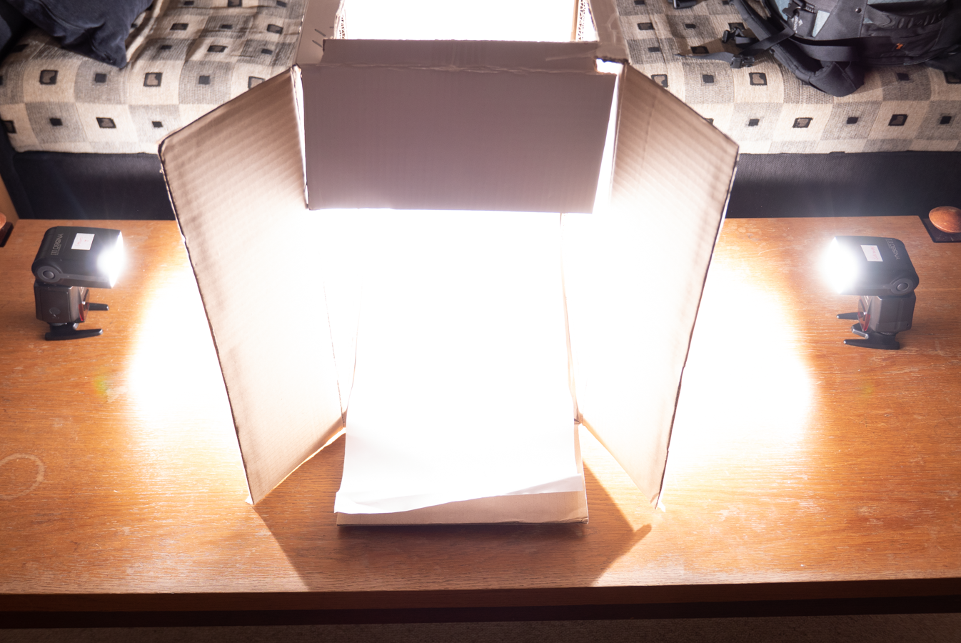 Dafür werden Sie einen größeren Karton benötigen und Transparentpapier (dieses können Sie problemlos durch Backpapier ersetzen). Schneiden Sie in drei Seiten des Kartons Löcher und decken Sie diese mit Transparentpapier ab. Das Innere des Kartons legen Sie mit einem größeren weißen Papier aus, das einen endlosen Hintergrund bilden wird. Legen Sie das Fotoobjekt in den Karton und beleuchten Sie diesen von den Seiten her. Wenn Sie in natürlichem Licht oder schwächerem Dauerlicht fotografieren, werden Sie eine längere Belichtungszeit benötigen und wahrscheinlich müssen Sie die Kamera irgendwie stabilisieren.