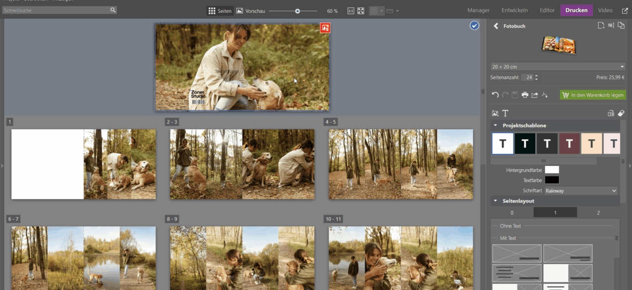 Das Erstellen von Fotobüchern wird in der neuen Version wesentlich komfortabler. Es gibt nun einen Filmstreifen mit Vorschauen der angrenzenden Seiten, mit dem Sie schnell zwischen den Seiten wechseln und Fotos direkt in das Layout ziehen können.