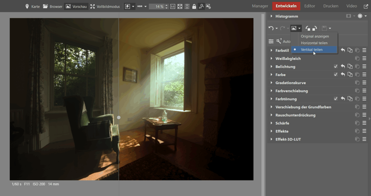 Neue Vorher-/Nachher-Ansicht in Entwickeln: Besserer Überblick bei der Bearbeitung