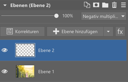 Der Editor arbeitet nicht direkt mit kreisförmigen Verläufen, sondern mit Ebenen, fügen Sie also zunächst eine weitere Ebene im Ebenenbedienfeld hinzu. Stellen Sie diese neue Ebene gleichzeitig auf den Mischmodus Negativ multiplizieren ein.