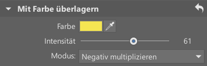 Die Weißtemperatur hat jedoch ihre Grenzen. Um eine deutlichere Farbverschiebung zu erzielen, scrollen Sie in den Schiebereglern nach unten zum Abschnitt Mit Farbe überlagern. Wählen Sie einfach ein helles Gelb oder Orange, erhöhen Sie die Intensität und probieren Sie die verschiedenen Modi aus. Zum Beispiel kann der Modus Negativ multiplizieren oder Aufhellen anstelle des Modus Normal interessant sein.
