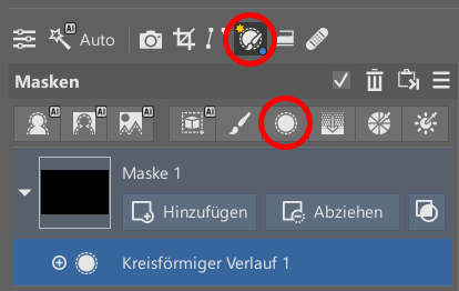 Richten Sie Ihre Aufmerksamkeit im Modul Entwickeln auf das Symbol Lokale Anpassungen und dann auf den Kreisförmigen Verlauf (R) (im Untermenü Masken).