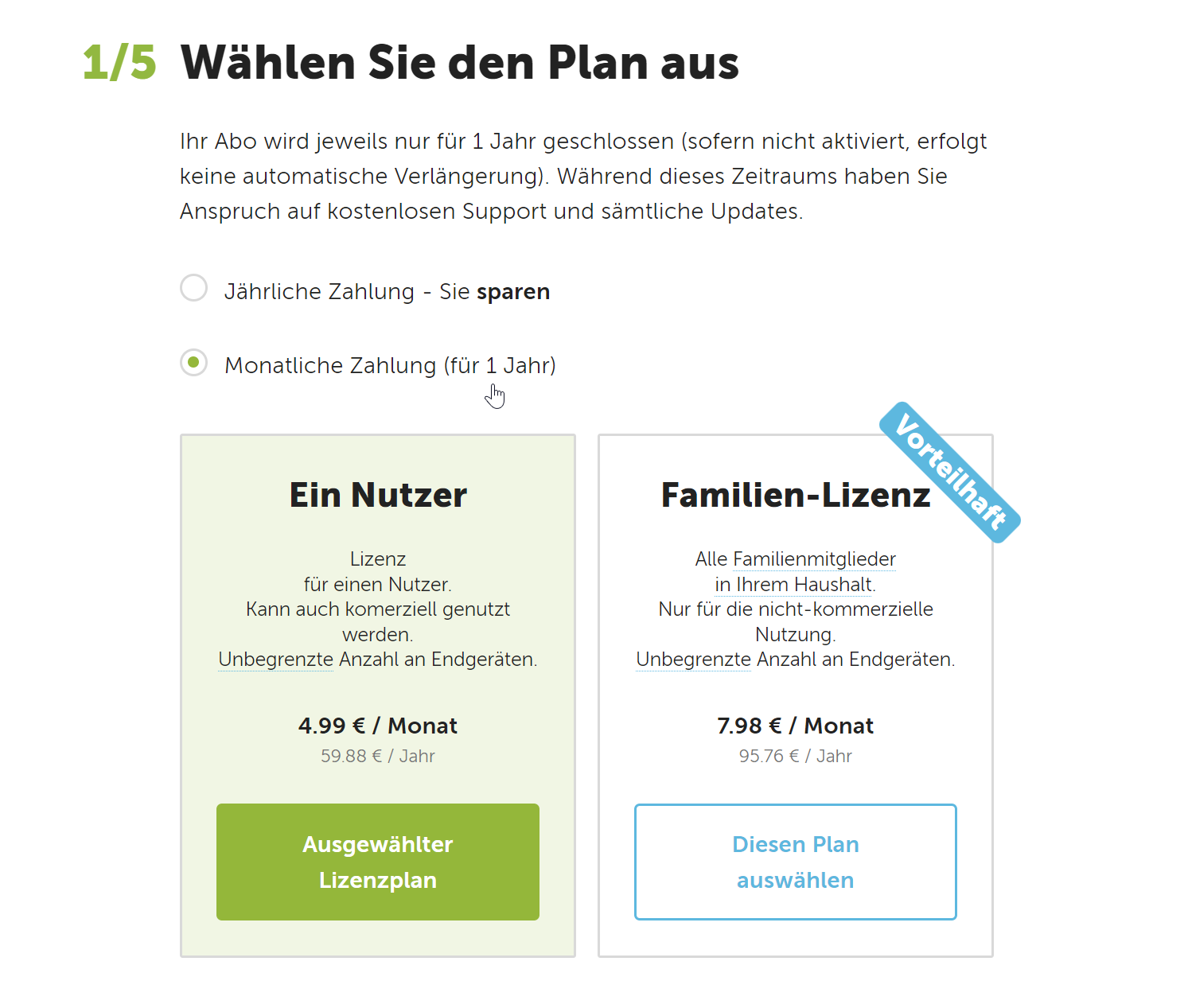 Sie können wählen, ob Sie jährlich oder monatlich für den von Ihnen gewählten Tarif zahlen möchten. Mit einer Jahreslizenz sparen Sie fast zwei Monatsgebühren. Die monatliche Lizenzzahlung wird am Jahrestag des Kaufs automatisch verlängert.