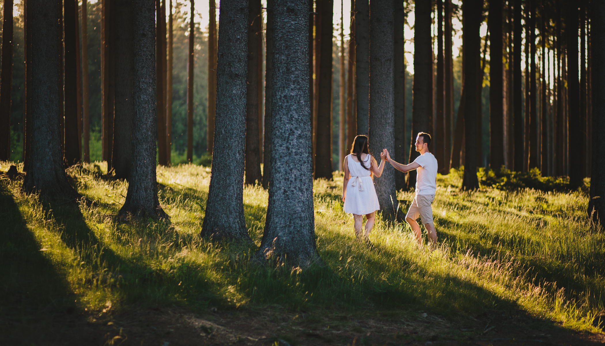 Und was ist mit den so beliebten Waldlocations? Mitten am Tag können dichte Wälder hervorragend funktionieren, da sie den gewünschten Schatten spenden. Das Gleiche gilt bei Sonnenuntergang. Doch bei ungünstigem Timing kann man sich plötzlich in einer dunklen Welt wiederfinden, in die das Sonnenlicht kaum vordringt und in der die Augen der Kunden auf den Porträts jeglichen Glanz verlieren. Das mag für einige wenige Aufnahmen interessant sein, die märchenhafte Mystik hervorrufen. Für eine ganze Serie kann es jedoch kontraproduktiv sein. Neben dem Wald sollten Sie auch eine weitläufige Wiese mit offenem Himmel in petto haben, die Ihnen ausreichend hochwertiges Licht bietet.