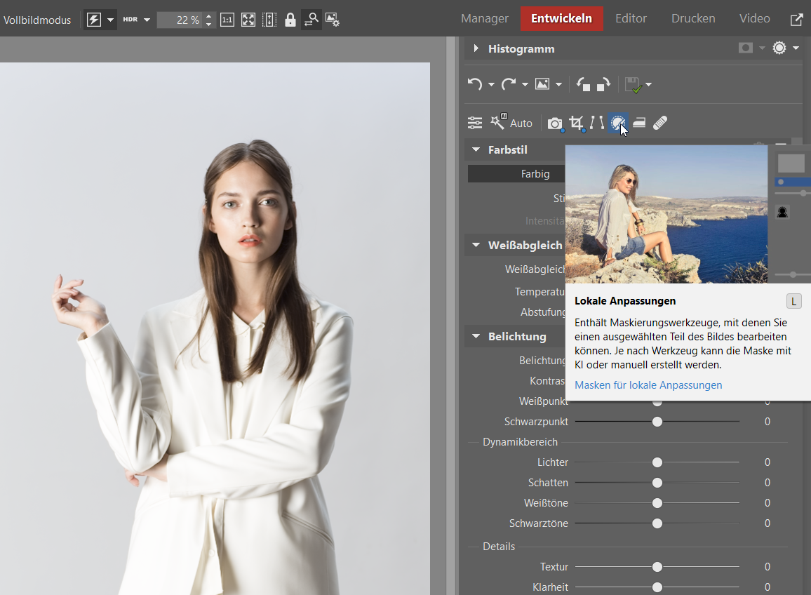 Ist die Bearbeitung destruktiv? Nein. Der gesamte Vorgang läuft im Modul Entwickeln ab und ist vollständig nicht-destruktiv, d. h. die Originaldatei wird nicht überschrieben.