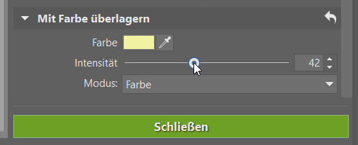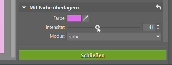 Scrollen Sie nun im rechten Bereich nach unten und suchen Sie den Abschnitt Mit Farbe überlagern. Wählen Sie eine beliebige Farbe aus, indem Sie auf das Farbfeld klicken, wählen Sie im Menü Modus die Option Farbe und stellen Sie mit dem Schieberegler Intensität ein, wie stark die Färbung sein soll.