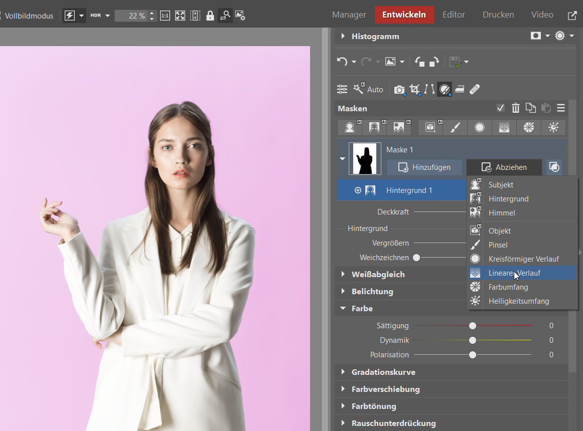 Klicken Sie im rechten Bereich auf diese erstellte Maske (in unserem Fall ist es Maske 1), wählen Sie die Option Abziehen und wählen Sie Linearer Verlauf. Jetzt subtrahieren Sie diesen Verlauf von der AI-Maske mit dem Hintergrund.