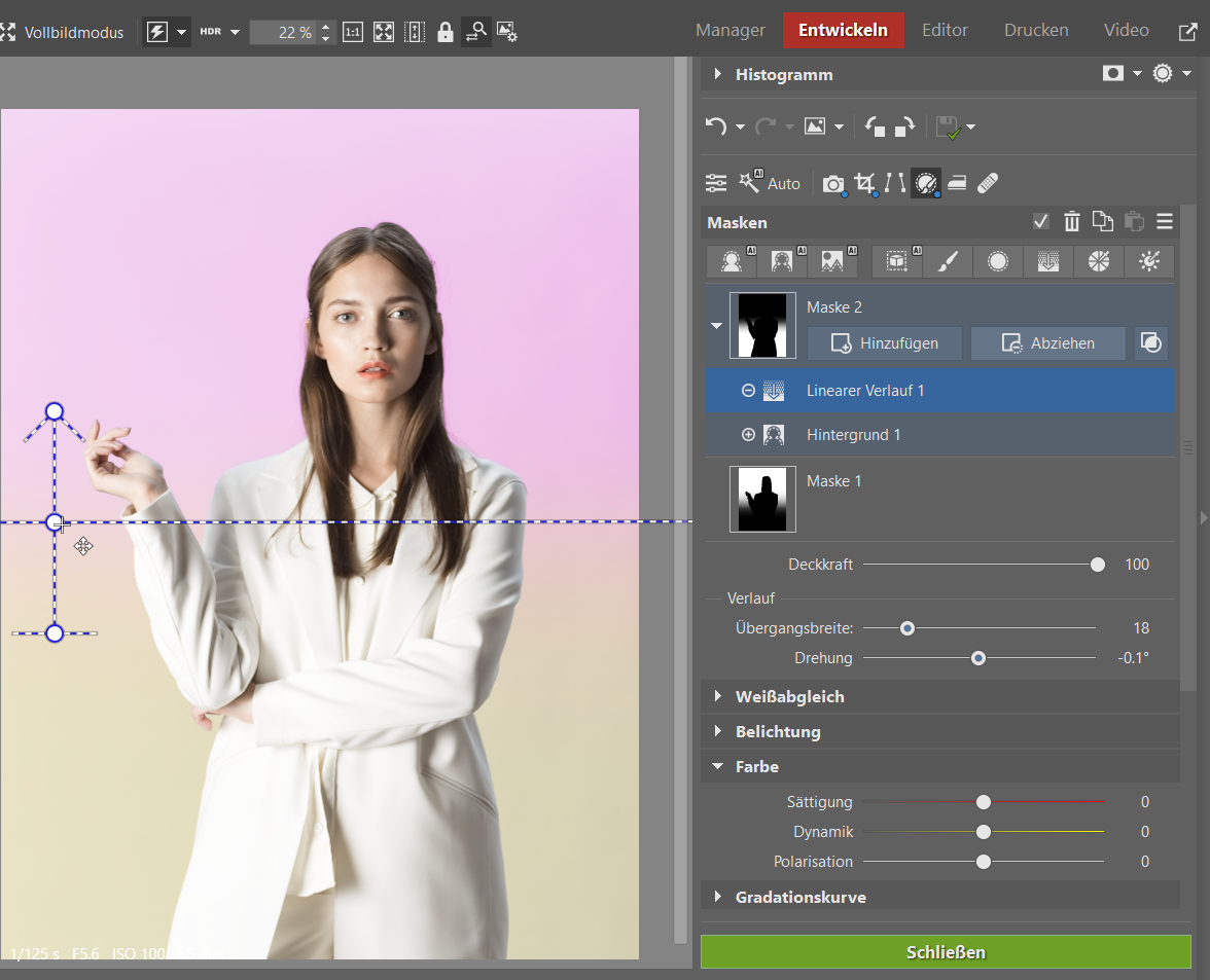Ziehen Sie nun erneut den linearen Verlauf von der Maske mit dem Hintergrund ab, nur auf dergegenüberliegenden Seite wie zuvor.