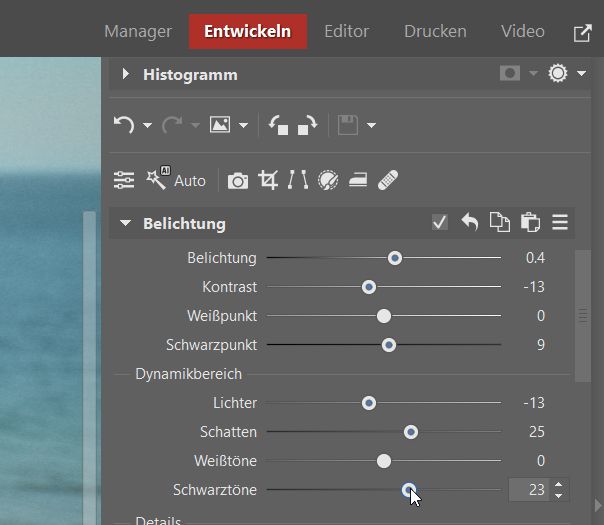 Beginnen Sie im Modul Entwickeln in Zoner Studio mit der Bearbeitung der grundlegenden Belichtungsparameter. Reduzieren Sie die Lichter, damit sie nicht überbelichtet sind und die Details erhalten bleiben. Heben Sie hingegen die Schatten leicht hervor, damit sie nicht komplett schwarz sind. Wenn das Foto immer noch zu kontrastreich ist, hilft auch eine leichte Verringerung des Gesamtkontrasts.