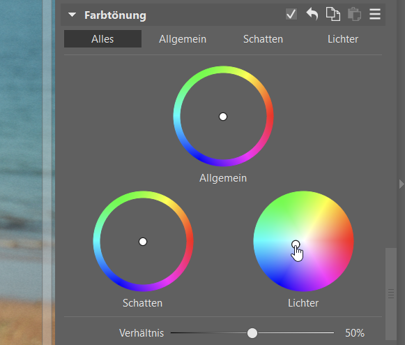 Sehr gut einsetzbar ist auch die Funktion Farbtönung. Damit können Sie Lichter und/oder Schatten ganz einfach in einem Farbton Ihrer Wahl einfärben. In unserem Fall reichte es aus, den hellen Bereichen des Fotos etwas Azurblau hinzuzufügen. Experimentieren Sie aber ruhig mit allen drei Kreisen.