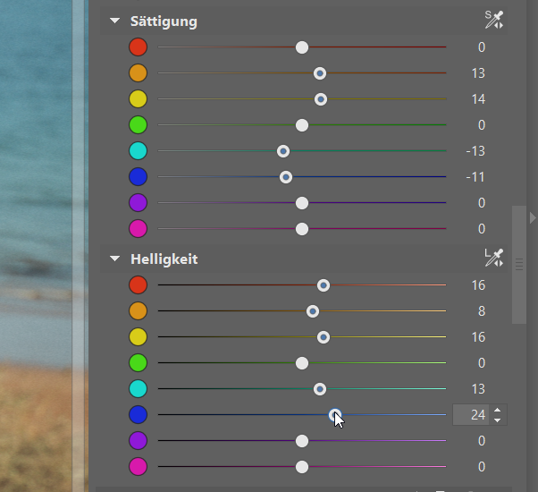 Neben der Verschiebung des Farbtons ist auch die Arbeit mit der Sättigung und Helligkeit bestimmter Farben wichtig. Einige Farben können Sie leicht entsättigen, andere hingegen können Sie kräftiger lassen. Gut funktioniert auch eine leichte Erhöhung der Helligkeit bei ausgewählten Farbtönen, wodurch die Farben weicher, luftiger und weniger digital wirken.