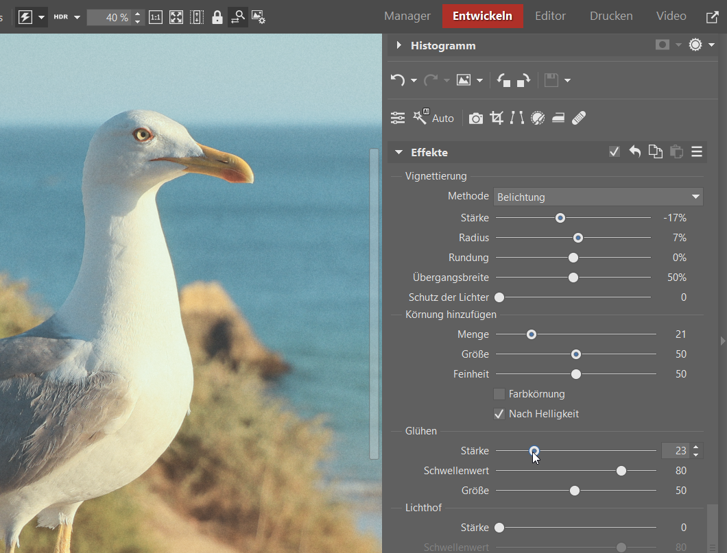 - Wie man Fotos dezente Effekte verleiht: Vignettierung, Körnung und Glühen.